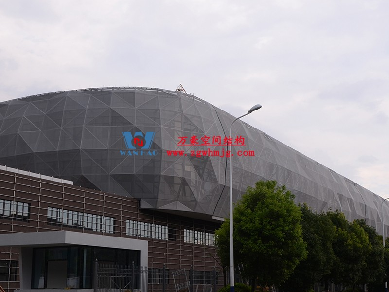 寧波菲仕展廳外立面網(wǎng)格膜結(jié)構(gòu)項目,方案由意大利著名建筑師設計,設計靈感取鉆石之意。為了實現(xiàn)多變的設計效果,整個外立面采用了8000根形狀各異的鋼構(gòu)件,每根桿件單獨編號、定位,實施難度極大。外層使用PTFE網(wǎng)格膜,樹立了PTFE網(wǎng)格膜使用的新標桿。用鋼量880噸,PTFE膜展開面積12660平方。