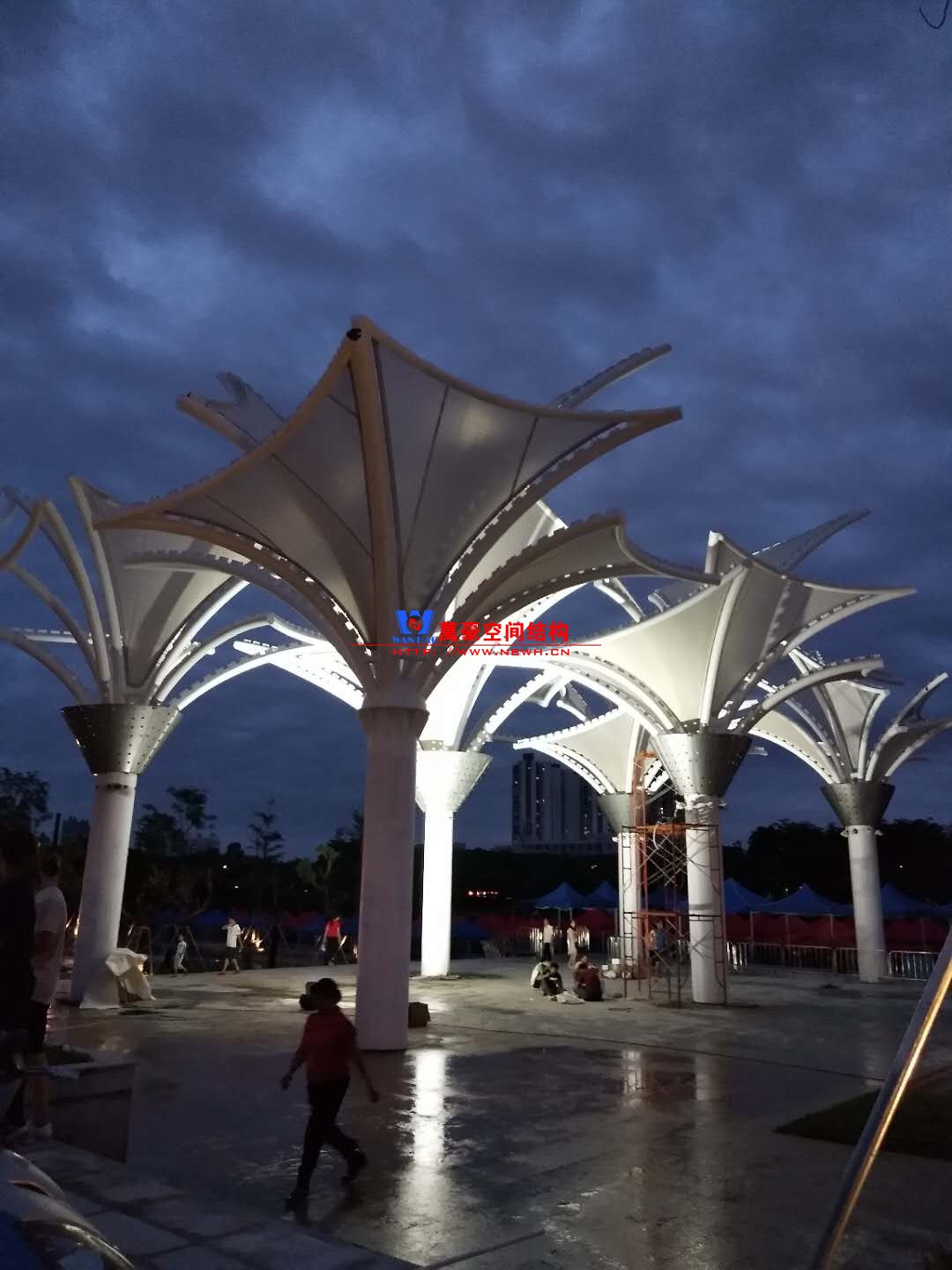 其中主席臺龍舟拉膜項目高度為7.25米,膜結構屋面材質為PTFE膜材。廣場鋼拉膜項目由六個龍船花造形景觀組成,每個龍船花景觀造形立柱的高度不得低于3.80米,花瓣造形最低高度 7.54米,花瓣造形最高高度9.608米,膜結構屋面材質為 PTFE網格基布雙面貼透明ETFE建筑膜。