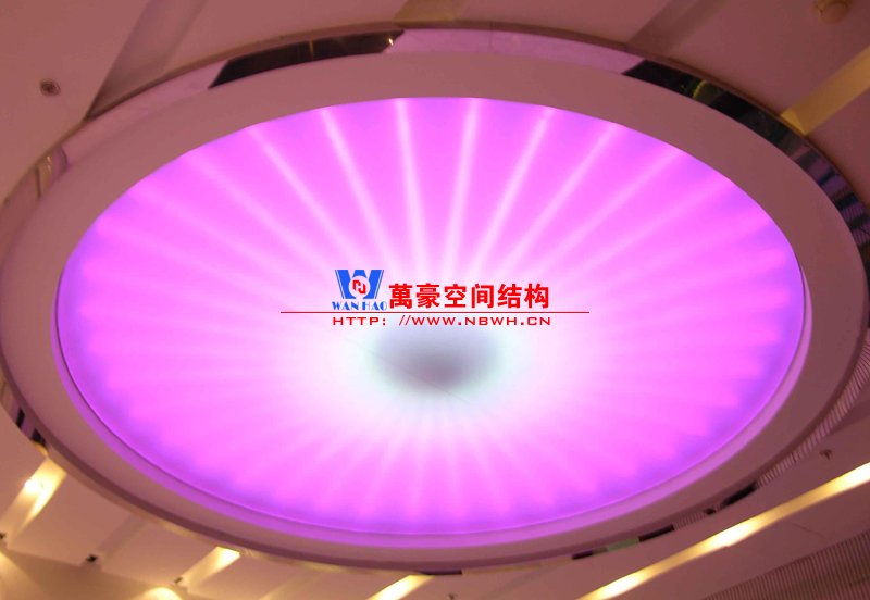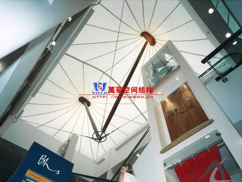 室內膜結構是膜結構工程的一種,是將膜結構設計技術應用到室內而產生的新型室內設計方式。它是一種全新的結構形式,集建筑學、結構力學、精細化工與材料科學、計算機技術等為一體,具有很高的技術含量。其曲面可以隨著設計師的設計需要任意變化,結合整體環境,建造出各種美觀、富有創意的室內形象工程。