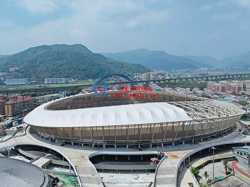 平陽體育中心設計功能為1.5萬座中型乙級體育場及其配套用房,總建筑面積49610平方米,其中鋼結構約3800噸、PTFE膜結構展開面積約25000平方。體育場鋼結構工程鋼柱采用箱型焊接截面,屋蓋采用19種不同跨度懸挑鋼桁架結構,節點均采用相貫焊接節點。屋面覆索膜結構,PTFE膜結構的使用,增加了整個體育場的空間感和動態感,也讓體育館成為了平陽當地的視覺焦點。