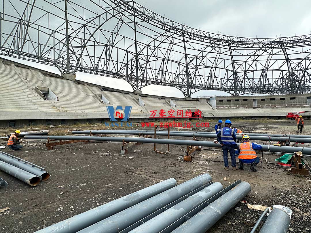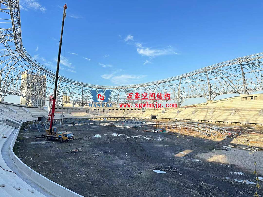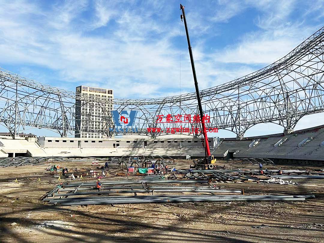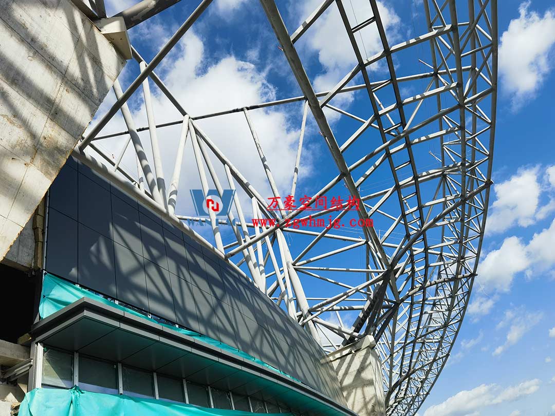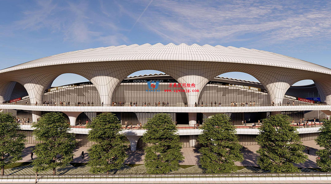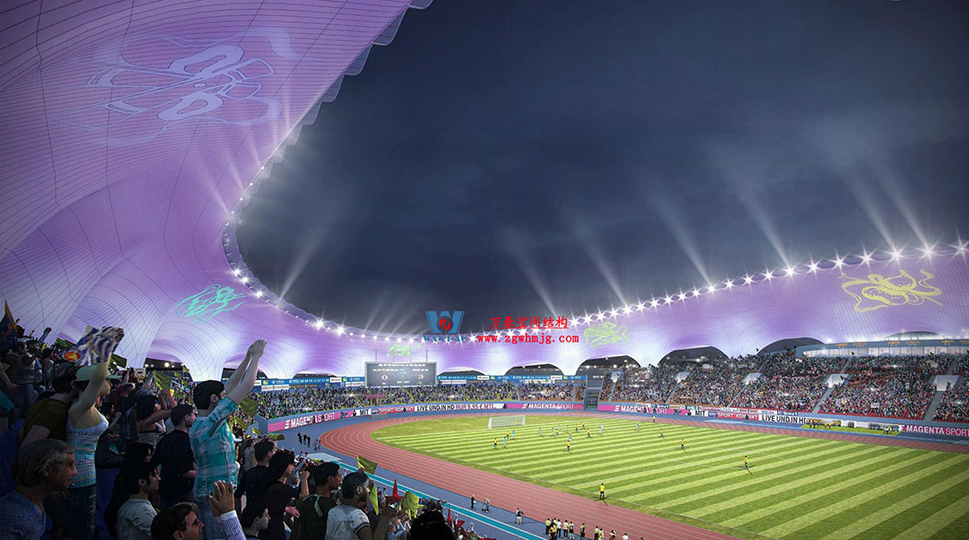 山東蓬萊體育場坐落于煙臺黃渤海新區(qū)蓬萊示范區(qū),該體育中心占地約200畝,總建筑面積5.6萬平方米。蓬萊體育場以“漂浮的仙島”為設(shè)計理念,運用龍骨優(yōu)化與雙曲鋁板單元化裝配工藝,以連續(xù)曲面構(gòu)成主體造型,頂部采用雙層PTFE膜材張拉完成,42500平方米流線型穹頂,以靈動曲線呼應(yīng)黃海波濤