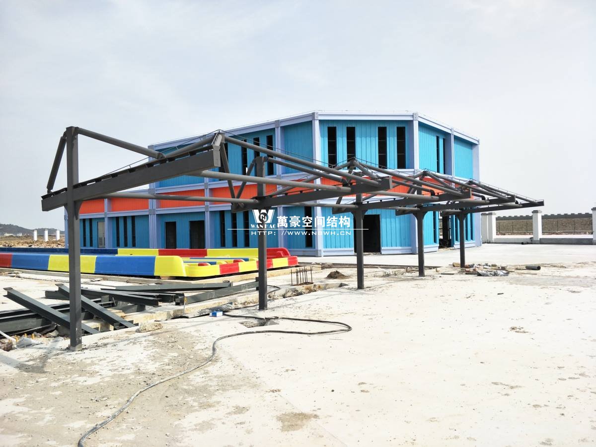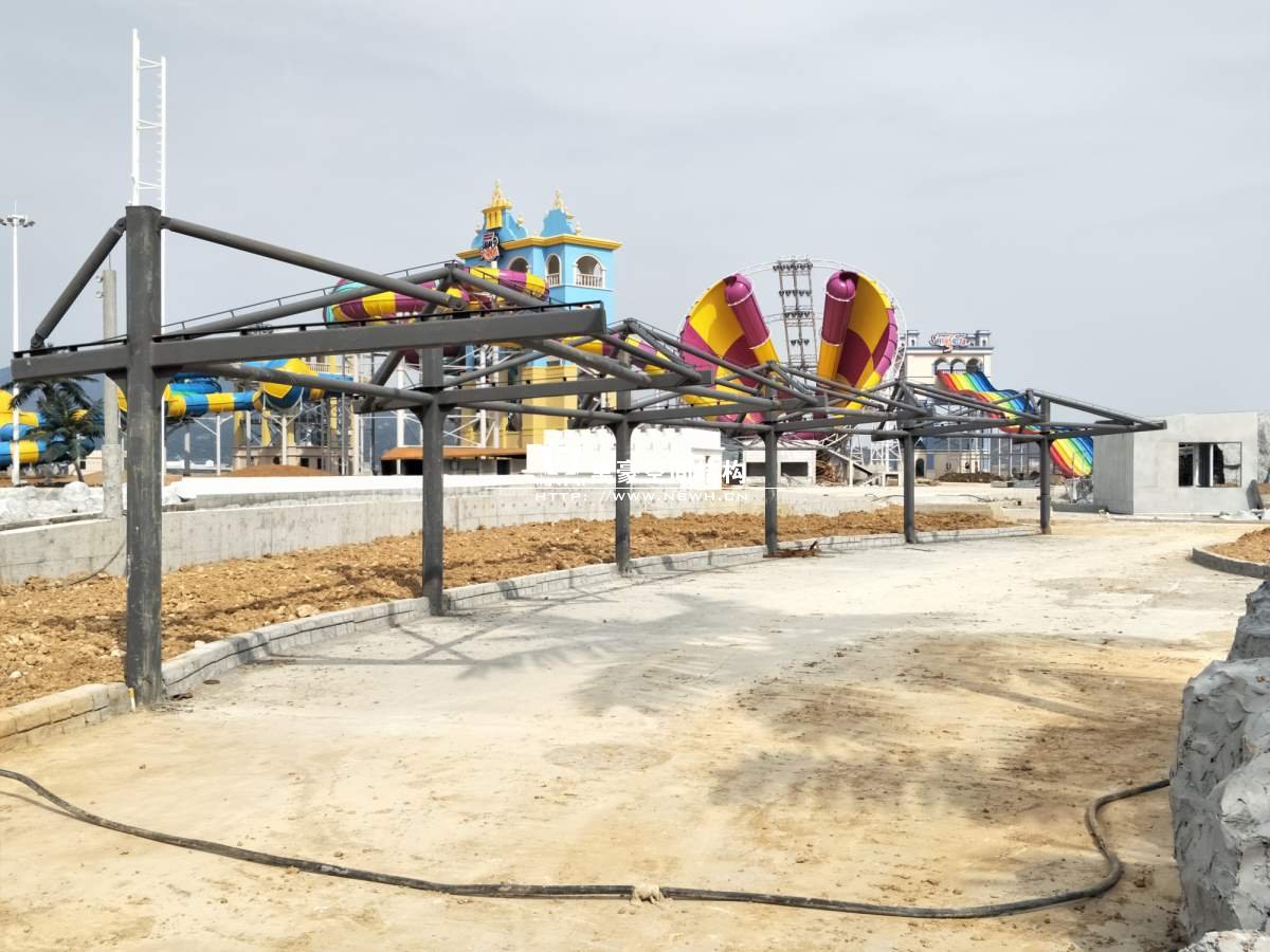 海闊天涳水世界鋼膜結構工程,由寧波萬豪空間結構工程有限公司承建。現場測量、深化設計、制作及安裝由寧波萬豪空間結構工程有限公司全權負責;用鋼量高達180噸,建筑面積達5000平米。