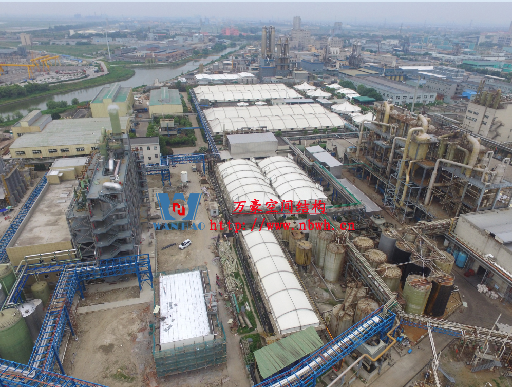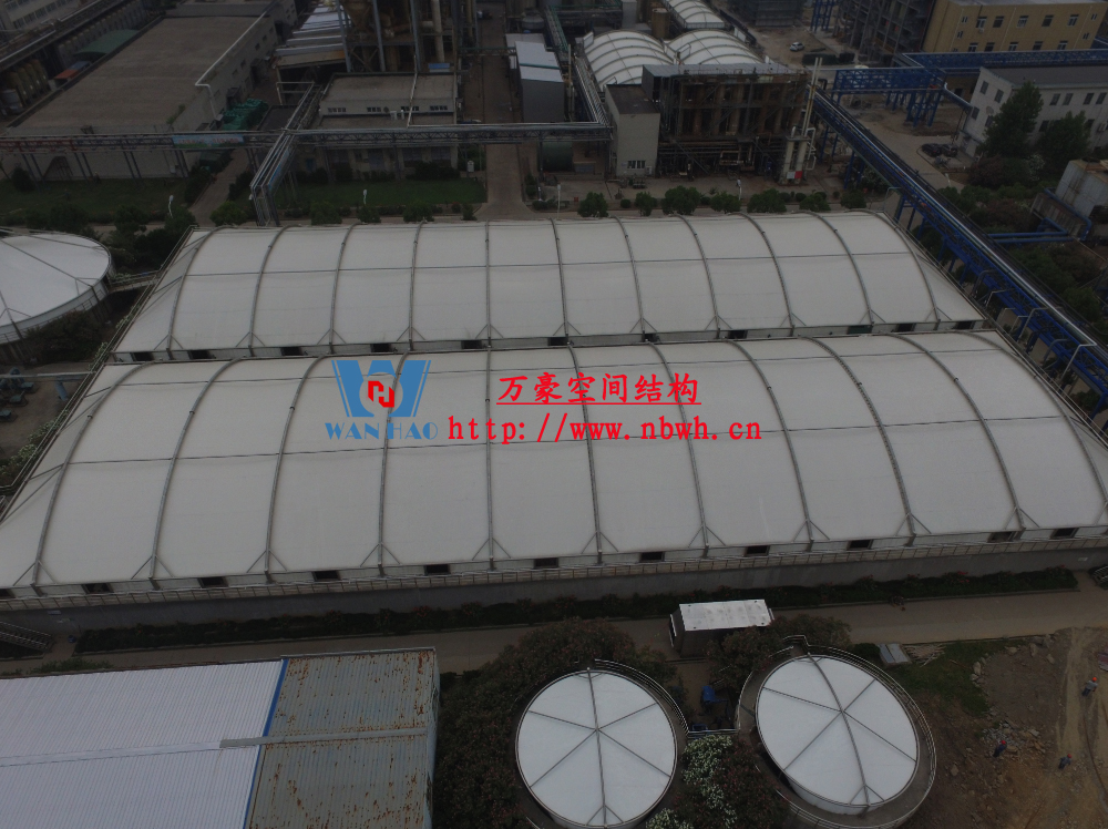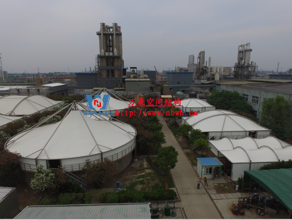 東廠區生化池膜結構加蓋工程,坐落于浙江省紹興市杭州灣上虞經濟開發區龍盛科技園內。整個項目由A/O池加蓋4座、二沉池加固定蓋4座、濃縮池加蓋2座、氧化池加蓋1座、氧化氣浮池加蓋1座、氧化集水池加蓋1座、出水調節池1座、安諾池1座,共計15座鋼膜結構組成。總用鋼量達350噸,膜結構展開面積達35000平方米。